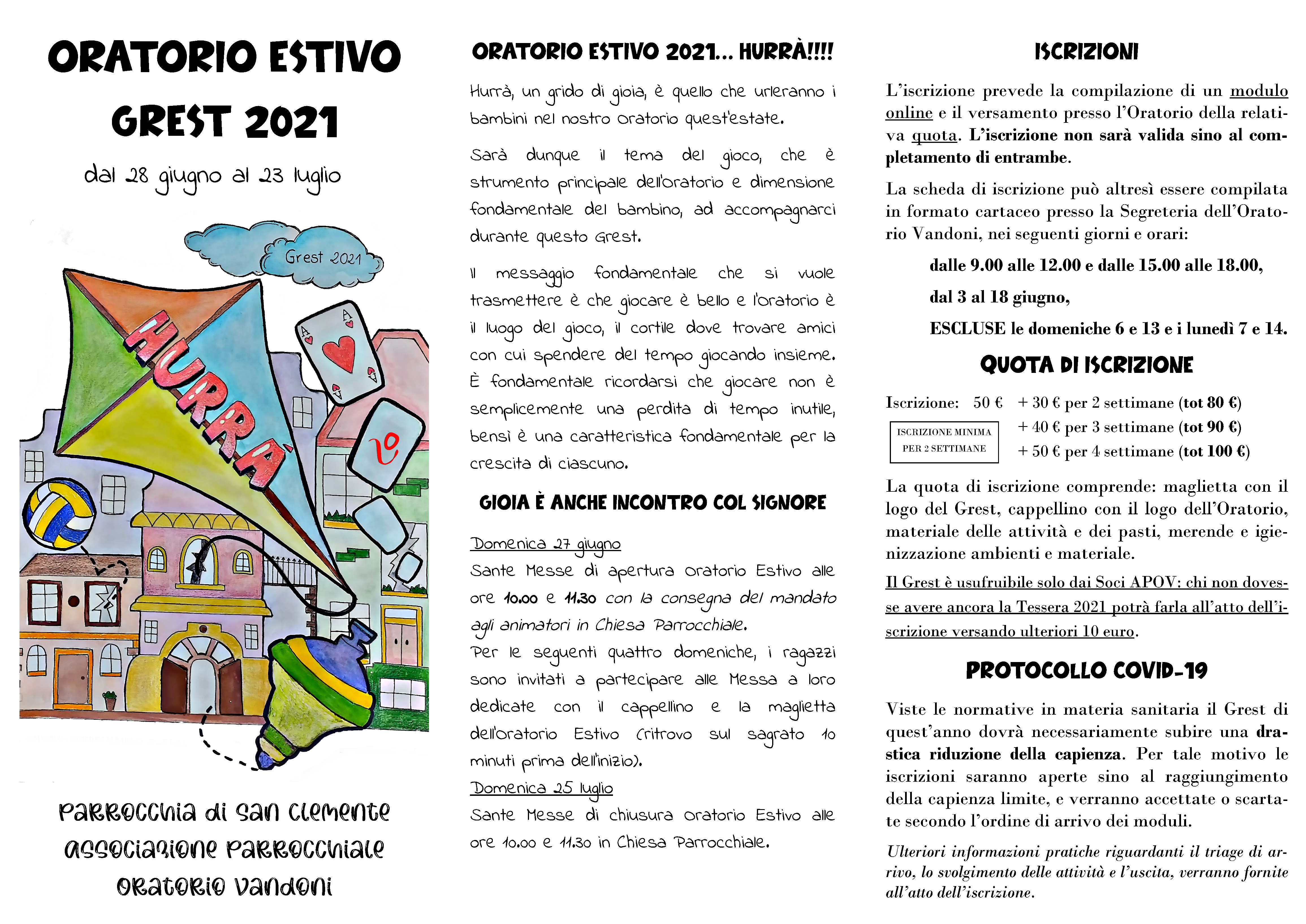 Dopo un lungo anno di scuola non c’è nulla di più bello che tornare a giocare nel nostro amato Oratorio, gridando un fortissimo HURRÀ! Sarà dunque il tema del gioco, che è strumento principale dell’Oratorio e dimensione fondamentale del bambino, ad accompagnarci durante questo Grest.