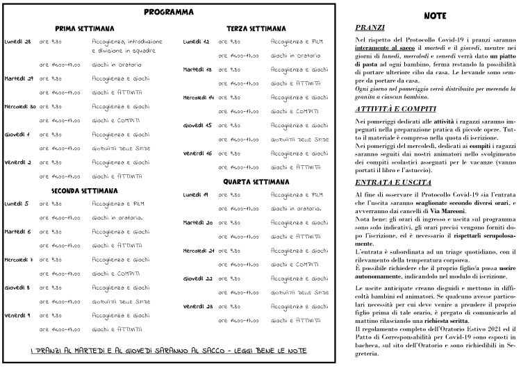 Dai un’occhiata sotto al volantino col Programma, leggi bene gli allegati (Regolamento, Patto di Corresponsabilità e Informativa sulla Privacy) e resta sintonizzato.