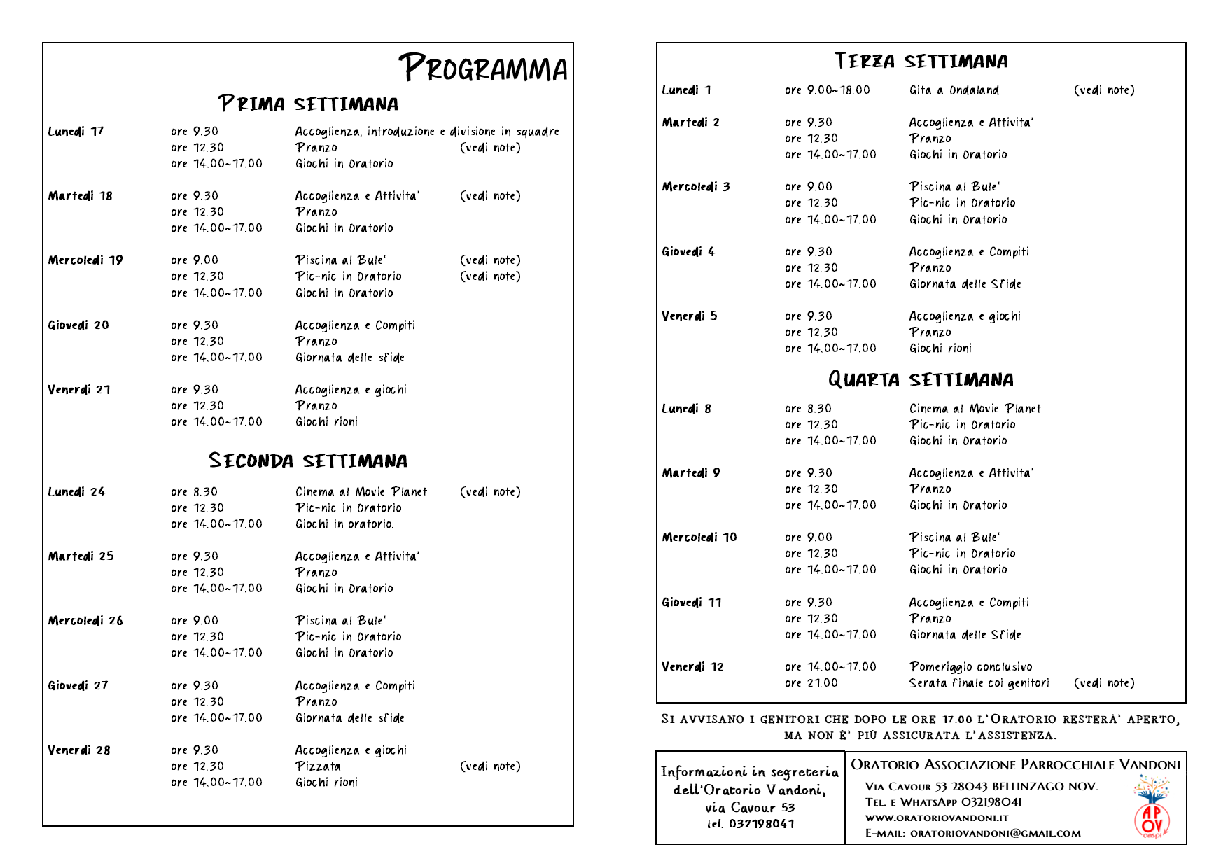 • Per garantire la sicurezza dei vostri ragazzi, i cancelli dell’oratorio vengono chiusi 15 minuti dopo l’inizio delle attività e vengono aperti alle ore 17.00. Per chi lo richiede ci sarà assistenza con consegna entro le 17.15.