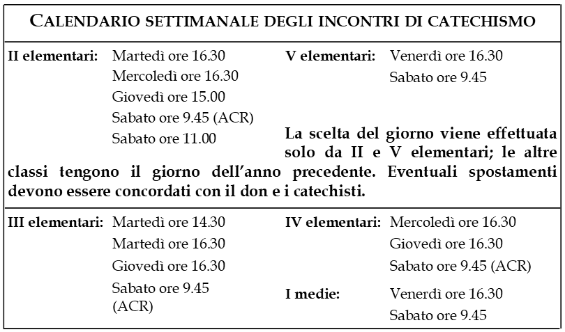 Da quest’anno le iscrizioni al catechismo, con relativo pagamento, andranno effettuate online a questo link, entro il giorno della riunione. I posti nei vari giorni e orari sono sino a capienza massima.