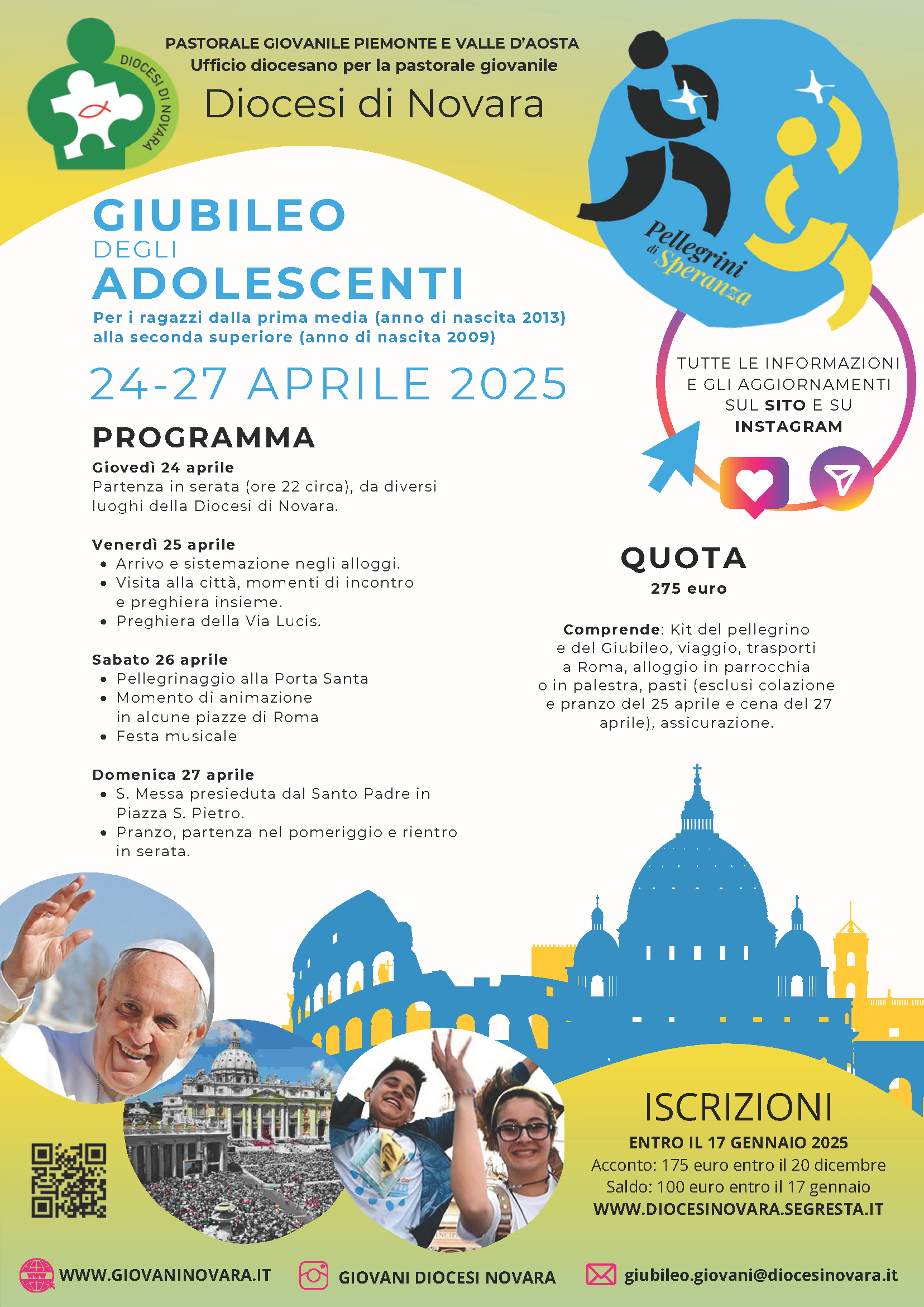 L’Oratorio di Bellinzago ha deciso di rispondere alla chiamata del Santo Padre per partecipare al Giubileo ordinario dell’anno 2025, indetto con la Bolla Spes non confundit (la Speranza non delude). Come Oratorio abbiamo pensato di aderire accogliendo la proposta della Diocesi di Novara per gli adolescenti, ovvero per le annate 2013, 2012, 2011, 2010 e 2009 (qui le info dettagliate). Per iscriversi al Giubileo bisogna seguire i passaggi elencati ENTRO IL 20 DICEMBRE: