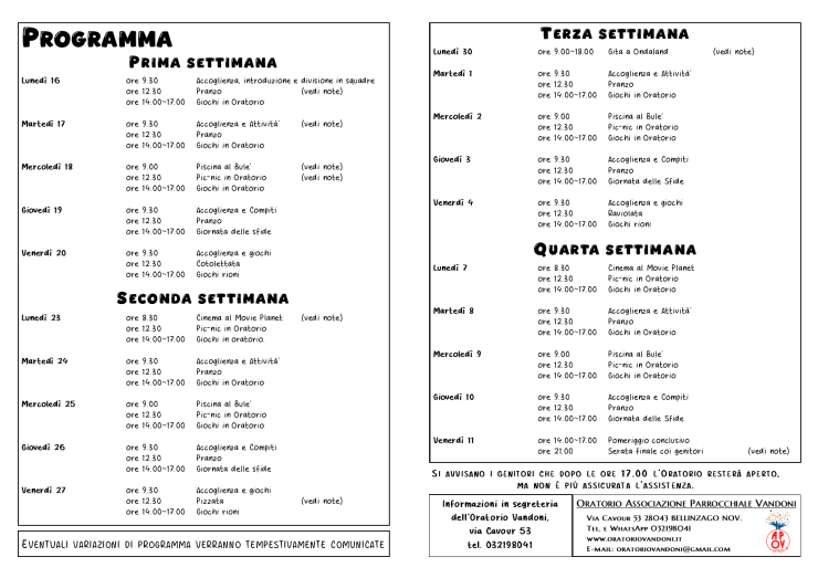 - Per garantire la sicurezza dei vostri ragazzi, i cancelli dell’oratorio vengono chiusi 15 minuti dopo l’inizio delle attività e vengono aperti alle ore 17.00. Per chi lo richiede ci sarà assistenza con consegna entro le 17.15.