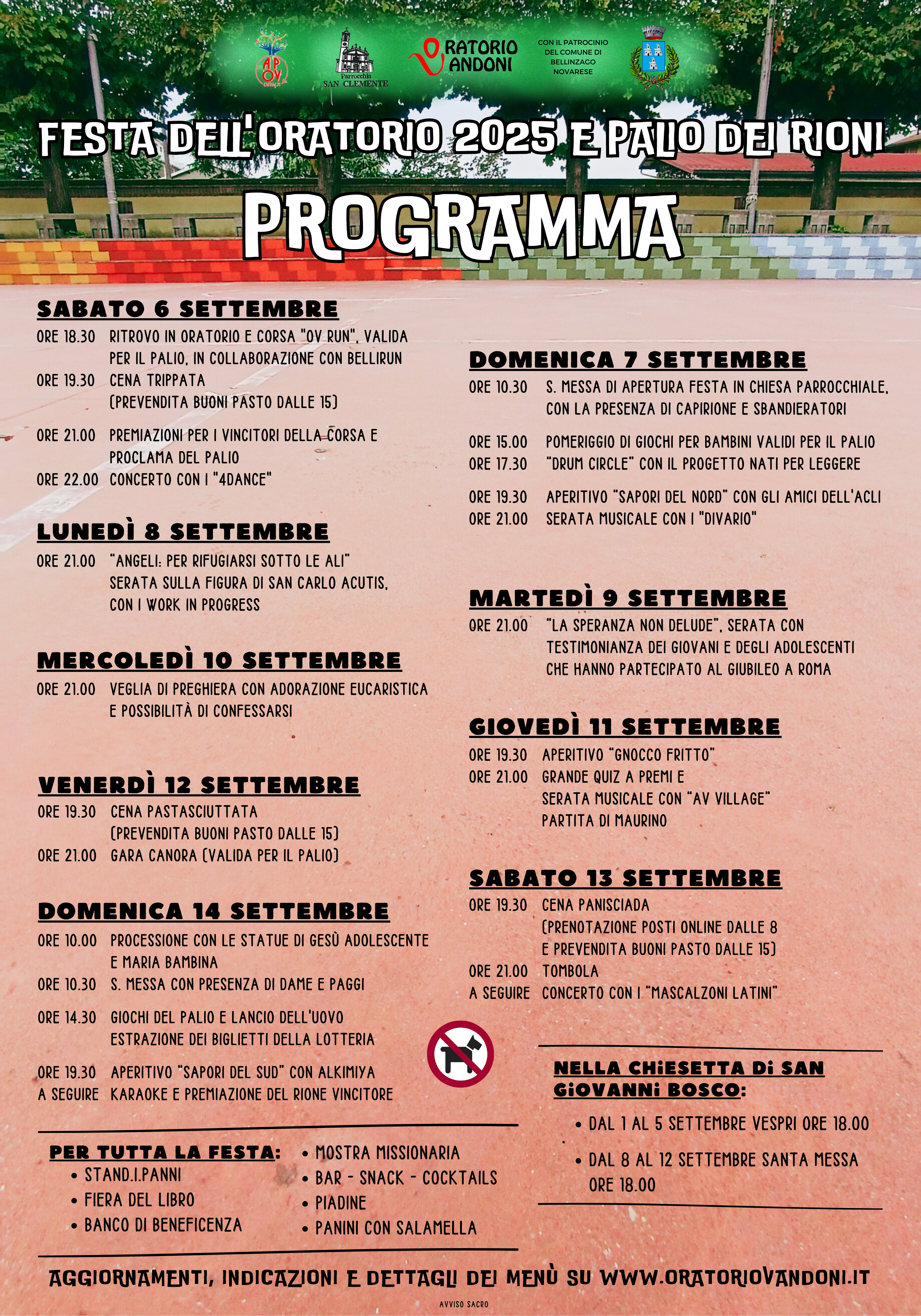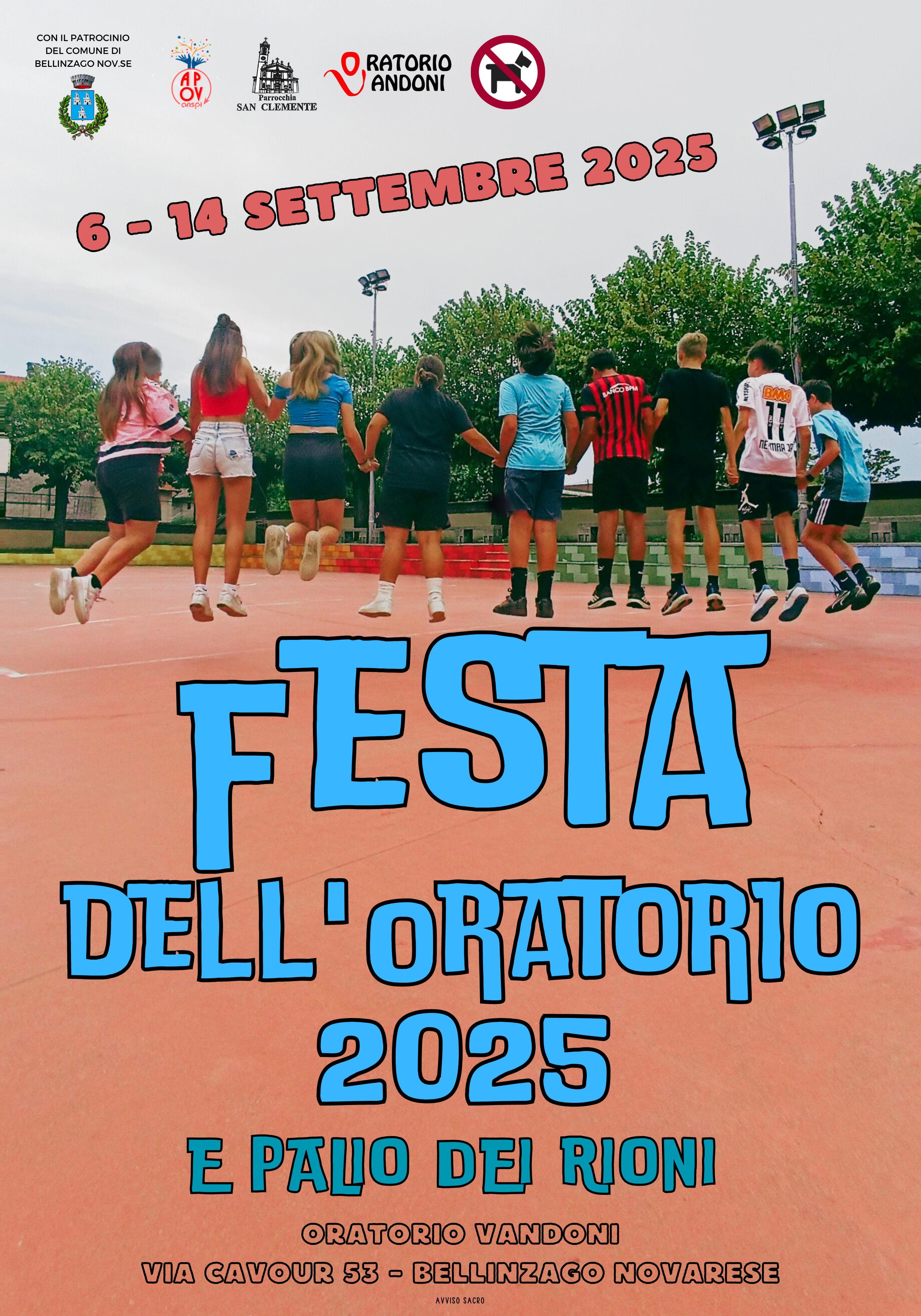 Siamo quasi a settembre e questo significa… Festa dell’Oratorio!!! Il ricco programma di quest’anno prevede diversi momenti sia conviviali che di riflessione e di preghiera, senza ovviamente dimenticare i tradizionali appuntamenti del Palio e il lancio dell’uovo.