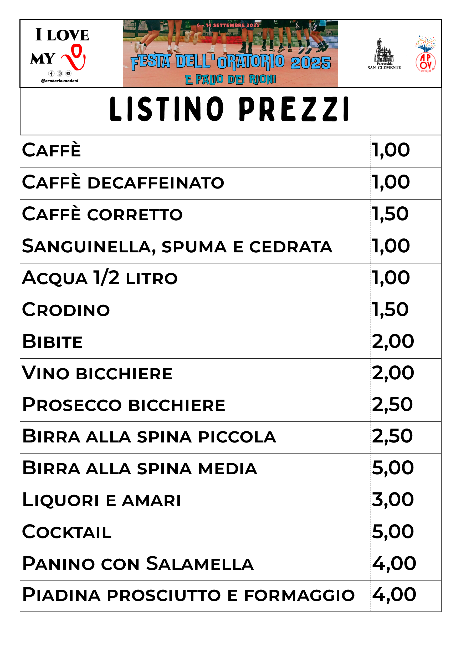 La cena termina alle ore 21.00: dopo tale orario saranno disponibili per la vendita solo piadine e panini con salamella.