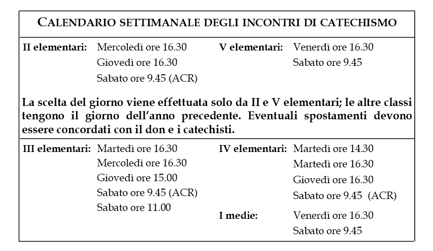 Da quest’anno le iscrizioni al catechismo, con relativo pagamento, andranno effettuate online a questo link, entro il giorno della riunione. I posti nei vari giorni e orari sono sino a capienza massima.