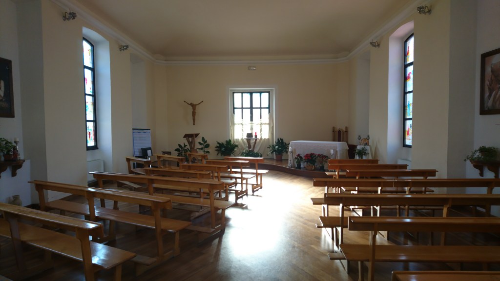 Le pareti della chiesetta hanno una forma regolare e simmetrica; sembrava importante dare movimento per staccare da questa staticità e offrire la possibilità di valorizzare alcuni elementi costitutivi del luogo di culto. Per questo la pedana ha una forma irregolare, in cui le tre curve che la costituiscono “avvolgono” e “custodiscono” il simbolo che vi è sopra: il tabernacolo, la Parola di Dio e l’altare. L’angolo della Parola di Dio con la presenza del Crocifisso al di sopra, un contenitore dove offrire le proprie preghiere, i cuscini e gli sgabelli, creano l’ambiente ideale per la preghiera personale e di gruppo, il luogo prediletto dai giovani. Nell’angolo opposto è stato collocato l’altare per la celebrazione dell’Eucarestia, la preghiera per eccellenza che rende presente il Risorto ed è la sorgente della preghiera personale, che nasce dall’esperienza di fede di una comunità che annuncia in Vangelo alle nuove generazioni. Al centro il tabernacolo, il ponte tra le due esperienze ed il cuore pulsante che rende vivo tutto.
