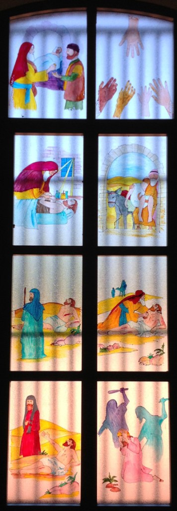 Dall’Antico Testamento si passa al Nuovo, attraverso tre riquadri tratti dall’evangelista Luca si illumina la chiesetta dell’Oratorio e il cammino della nostra vita con Gesù. La parabola del Buon Samaritano ci racconta l’importanza di vedere e avere compassione dell’uomo ferito. Nel cammino della vita ci sono percorsi faticosi, ci possono essere cadute, si può perdere la meta, ci si può arrendere, anche gli altri possono essere di ostacolo al nostro cammino (briganti). Ma se troviamo, se siamo, il buon samaritano possiamo infondere “olio di consolazione” ai nostri fratelli. La Chiesa ha il compito di prendersi cura, come l’albergatore, dei fratelli feriti perché al ritorno del Messia gli sarà ridonato l’Amore dato a loro. Ma nel racconto vi è la storia stessa di Gesù, che come pellegrino sale a Gerusalemme per donare la sua vita per noi: è Lui il Buon Samaritano, che si fa carico dell’uomo ferito, offre la sua vita per guarire le nostre ferite e, nel contempo, è lo stesso uomo ferito e messo a morte dai nostri peccati. Ma Gesù si “nasconde” in ogni uomo piagato, perché “ogni volta che facciamo qualcosa per i fratelli più piccoli lo facciamo a Lui” e per questo ci invita a “fare anche noi lo stesso”, a tendere la nostra mano amica verso il bambino, l’anziano, il forestiero, il malato…