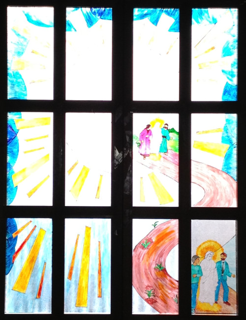 All’inizio di questo itinerario ci siamo detti che la vita è un cammino, un cammino fatto non da soli ma con Dio, un cammino che ha un punto di partenza e un arrivo; non poteva essere migliore l’immagine della vetrata centrale per fare sintesi di tutto questo, con il racconto del viaggio dei Discepoli di Emmaus. Al centro della scena l’ostia spezzata ci ricorda il momento in cui i discepoli riconoscono Gesù Risorto. E’ proprio Lui che ha camminato con loro e ha illuminato l’oscurità (il colore blu che contorna le vetrate) della loro tristezza, dettata dal vedere il loro sogno, il loro progetto, infranto dalla morte del maestro: un vero e proprio fallimento. La vita ha anche questo aspetto del sentirsi falliti, ma Gesù si inserisce anche qui, “fallisce” con noi e per noi, per ridarci attraverso la Sua luce la speranza e la fiducia in Lui. I raggi di luce della vetrata indicano e illuminano ciò che Gesù ha sottolineato nell’incontro con i discepoli: la Parola di Dio (l’Ambone), il mistero della Sua morte (la Croce), la risurrezione e la sua continua presenza (l’Altare per la celebrazione dell’Eucarestia). Vivere il percorso dei discepoli di Emmaus è scoprire la propria fede e ciò su cui si fonda, è un percorso che inizia con loro e che continua nella vita di oggi; ecco perché i discepoli al centro della scena hanno gli abiti del tempo di Gesù, mentre quelli in primo piano hanno abiti moderni. L’anello che congiunge il racconto di duemila anni fa con noi è il frammento dell’Eucarestia, che ogni giorno rende presente il Signore Risorto nella Chiesa e nel mondo. Quella storia è la nostra storia, quell’incontro è il nostro incontro, quel Risorto, invisibile ad occhio nudo, è visibile quando il nostro cuore “arde” d’amore, del suo Amore.