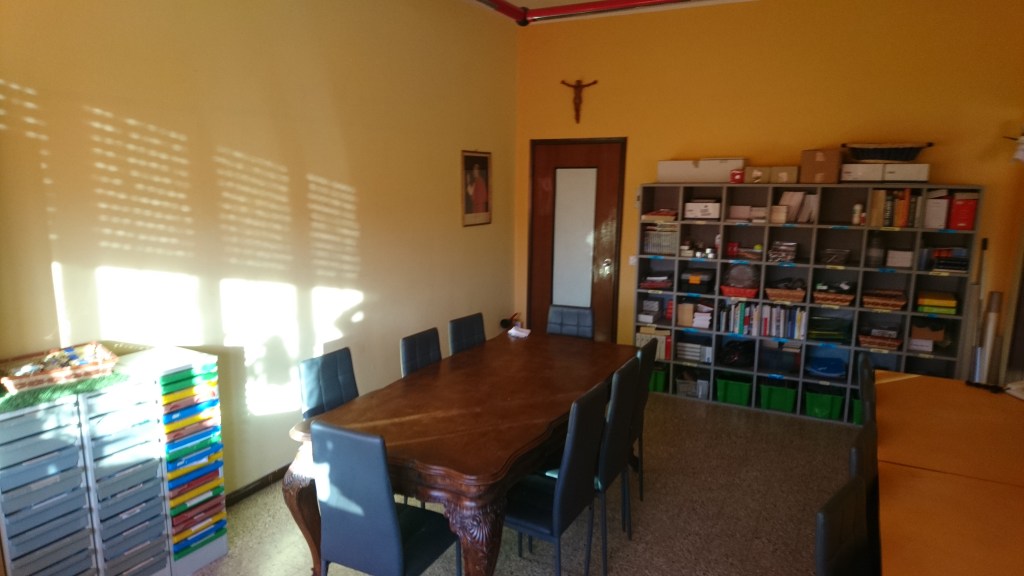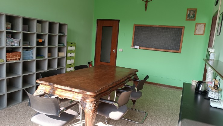 La casa del Vicario parrocchiale si trova nell’edificio che si affaccia sul campo rosso, al primo piano, ed è raggiungibile grazie alle scale che partono dalla porta adiacente alla segreteria. Oltre all’unità abitativa vera e propria al primo piano vi si trova anche la sala utilizzata dagli animatori e dai catechisti per le riunioni di programmazione e la sala adibita a stamperia.