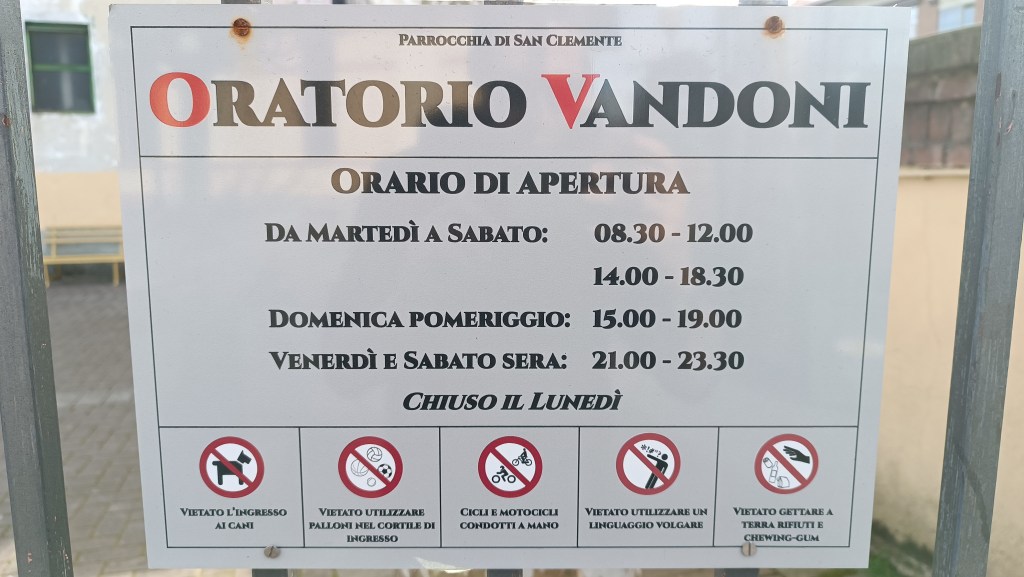 L’ingresso principale dell’Oratorio offre una vista accogliente dell’Oratorio, permettendone l’accesso alle persone. Sul cancello elettrico è possibile trovare un cartello con esposti gli orari di apertura e le regole interne di comportamento.