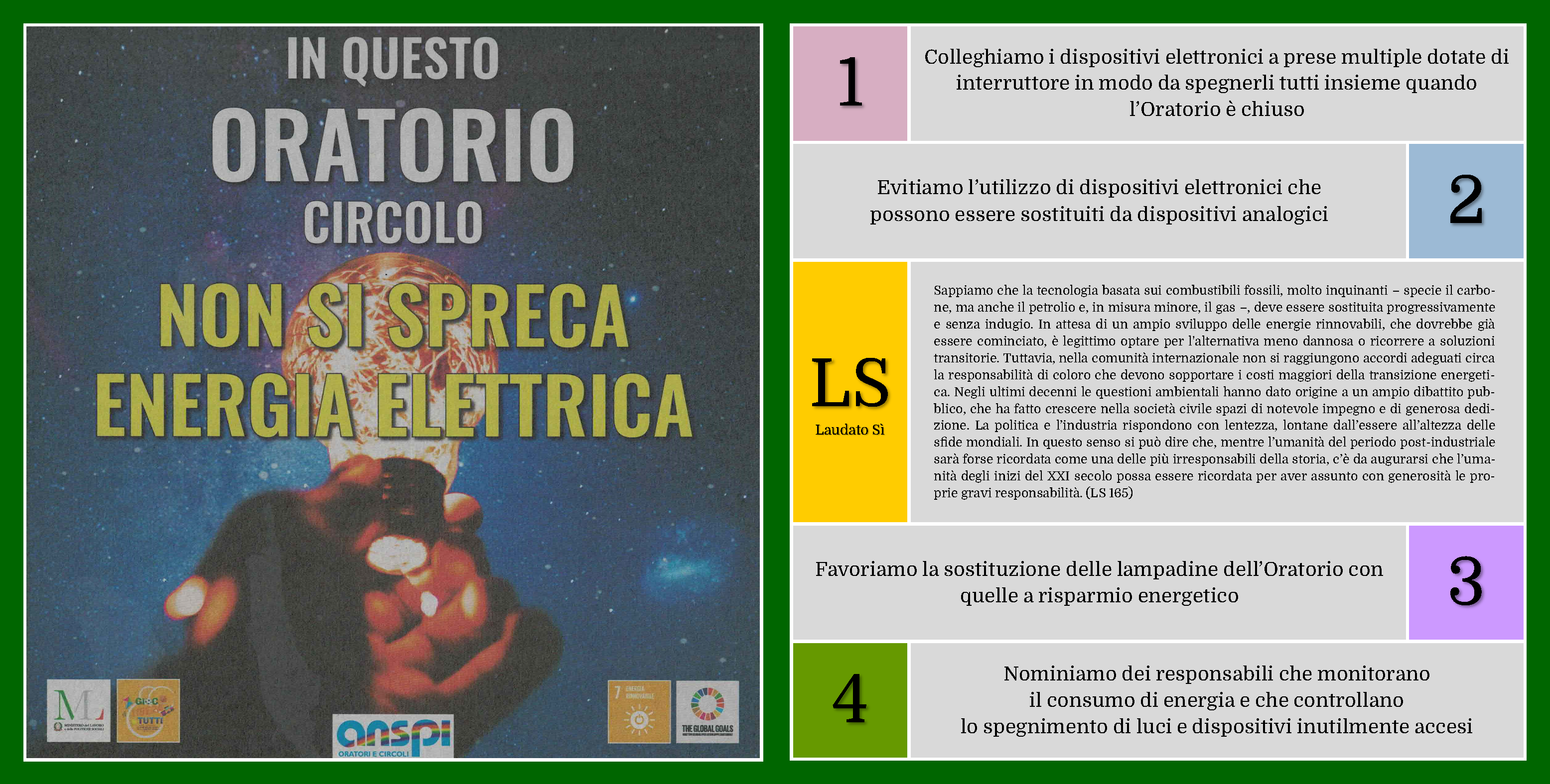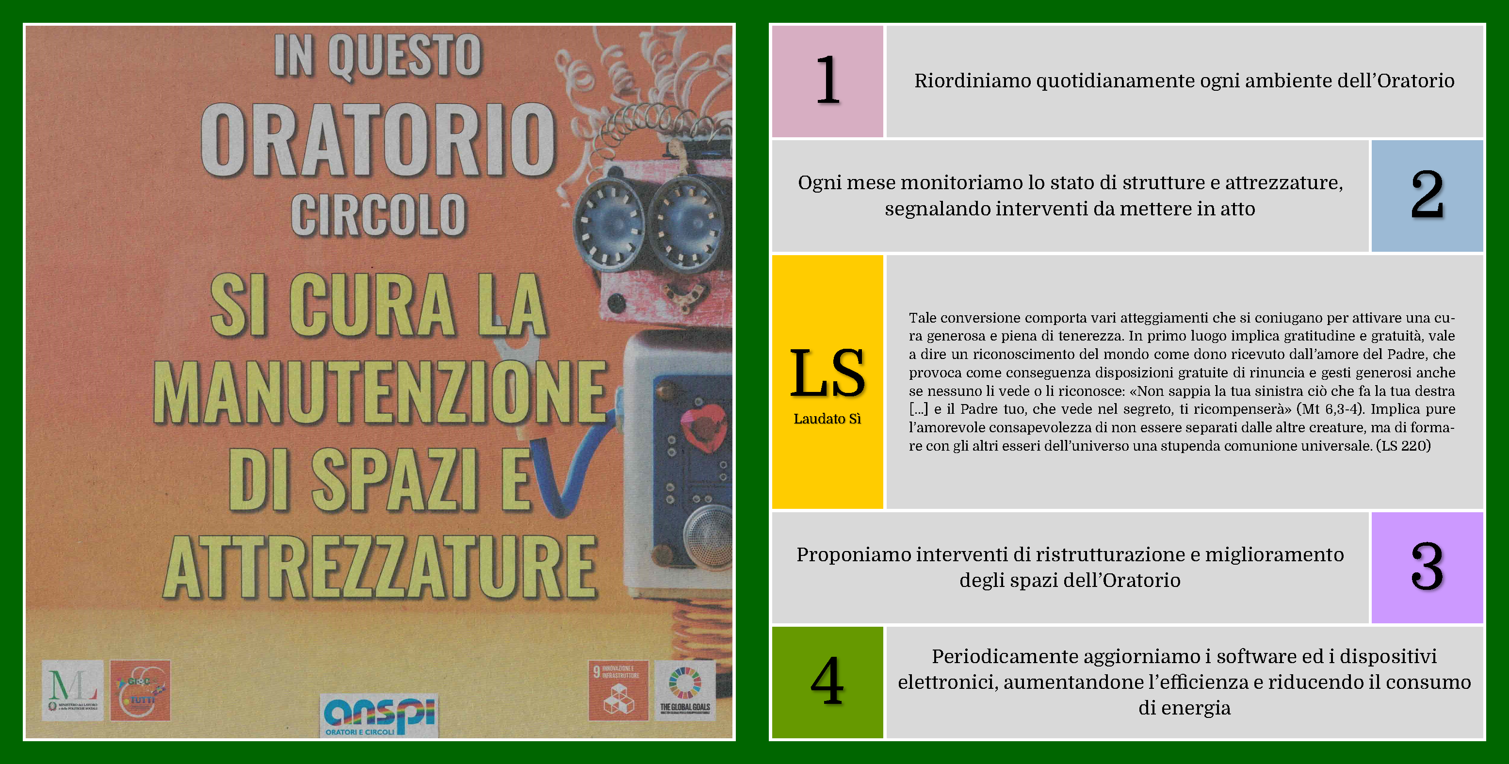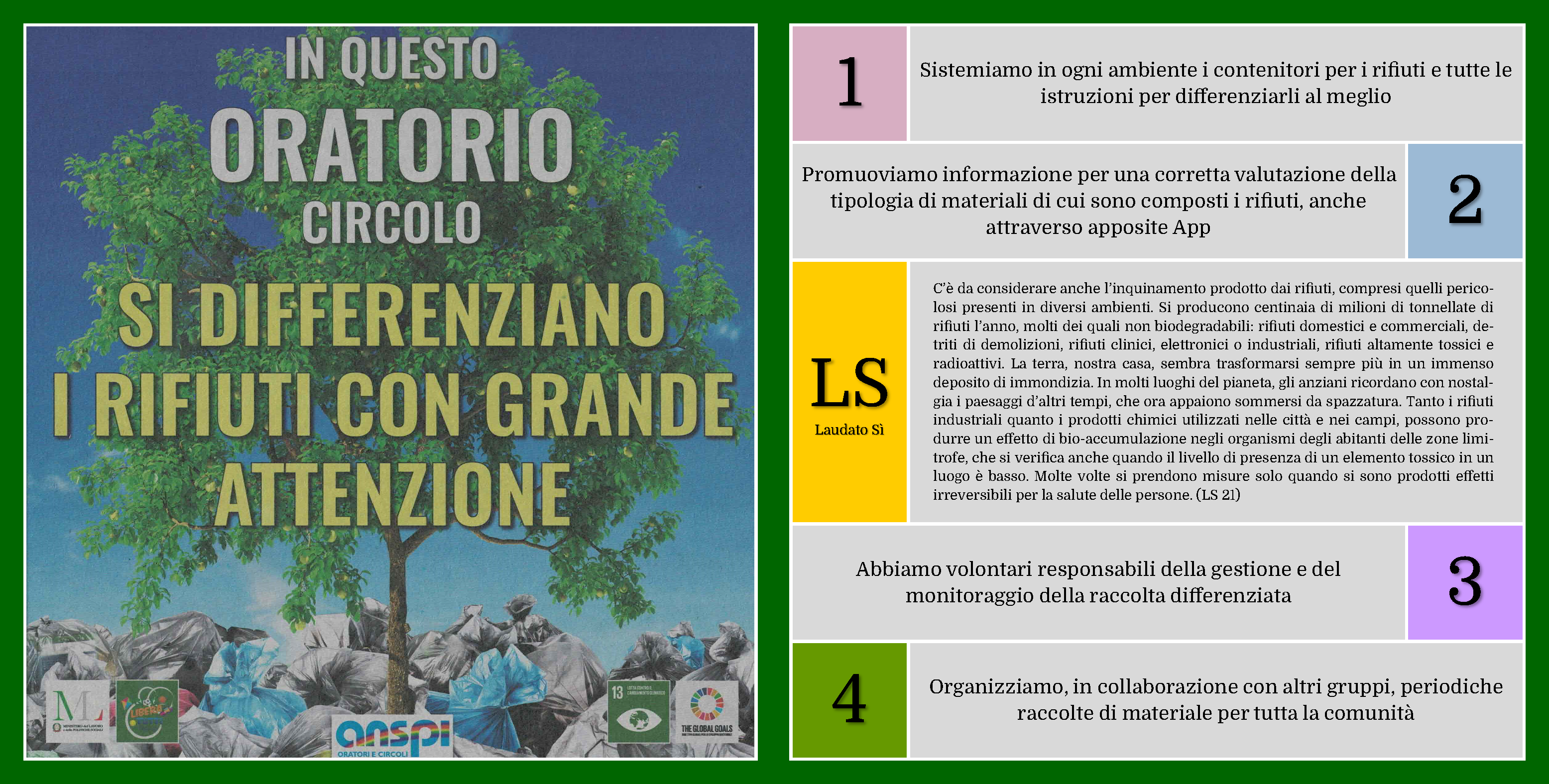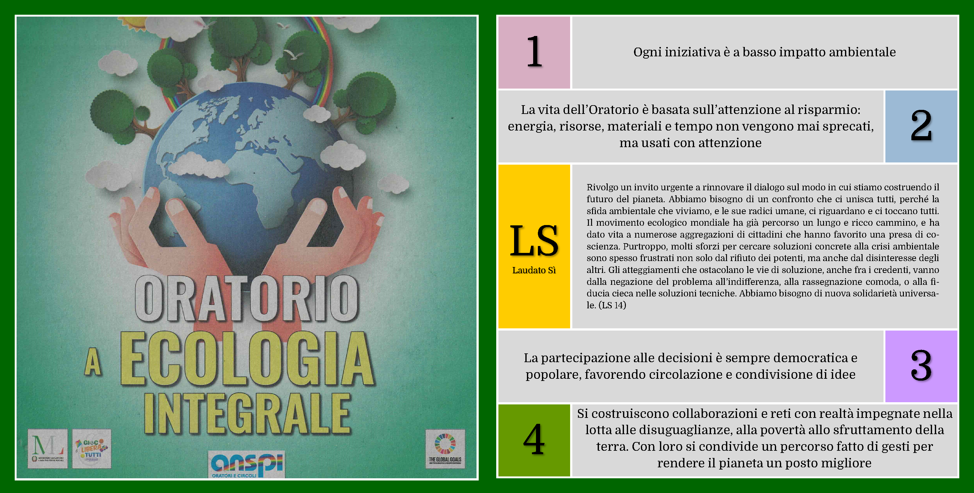 L’Oratorio Vandoni si impegna concretamente a promuovere, seguire e rispettare i princìpi di Ecologia Integrale contenuti nell’Enciclica Laudato sì